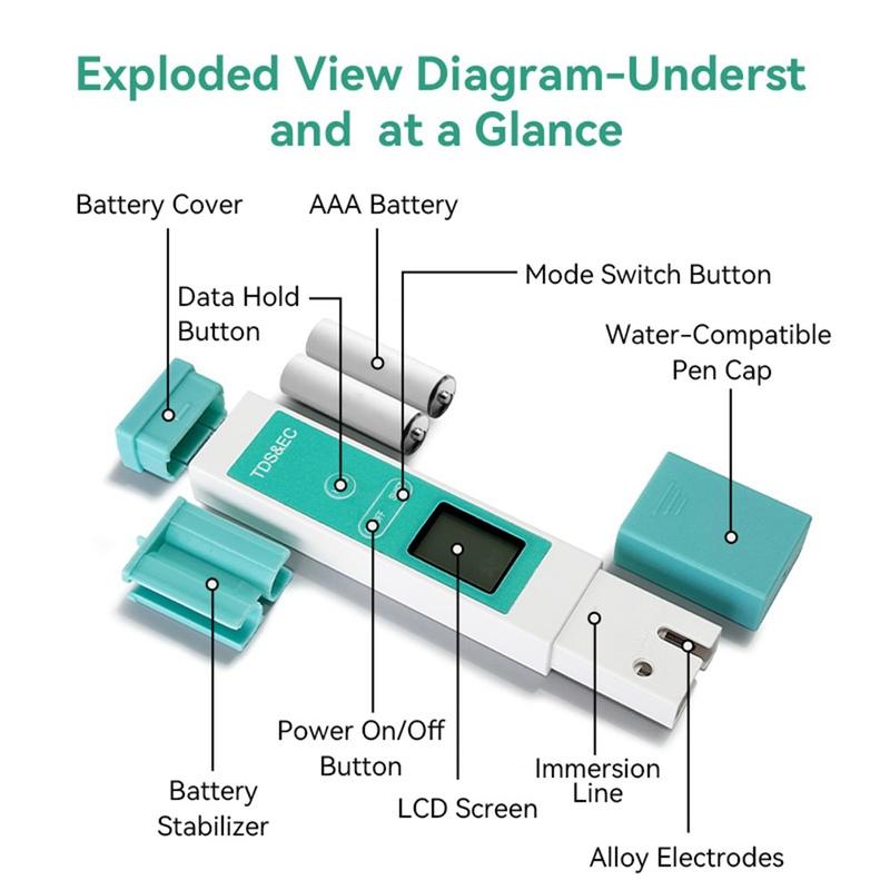 Il tester di qualità dell'acqua A13 fornisce letture accurate di EC (conducibilità elettrica), TDS (solidi totali disciolti) e temperatura dell'acqua, fornendo un quadro completo della qualità dell'acqua potabile a casa o in viaggio.