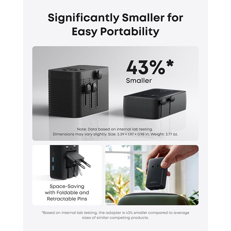 - Design ultracompatto, 43% più piccolo di adattatori simili, con pin pieghevoli e retrattili