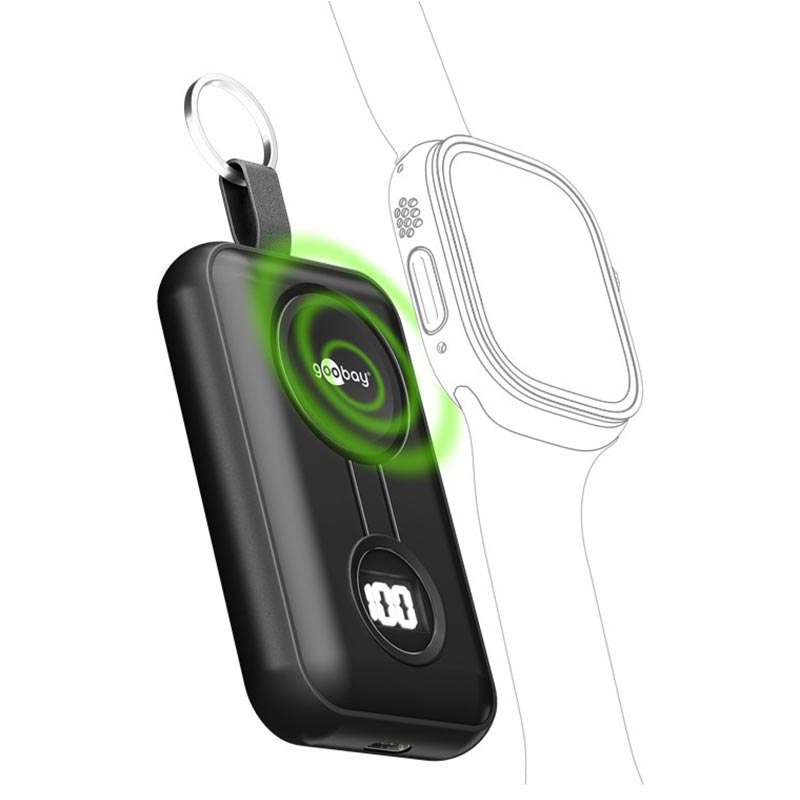 Goobay Wireless Power Bank per Apple Watch 2500mAh - Caricatore magnetico per orologi con USB-C, display LED, portachiavi, 2,5W wireless / 5W cablato