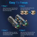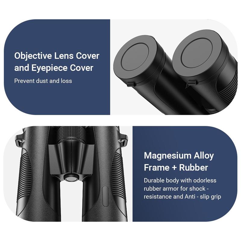 Progettato per funzionare in tutte le condizioni atmosferiche, questo binocolo è dotato di un grado di impermeabilità IPX7, che garantisce una visione chiara anche in caso di pioggia intensa o umidità. L'esterno rivestito in gomma offre una presa sicura e antiscivolo e una maggiore resistenza agli urti per un uso robusto all'aperto.