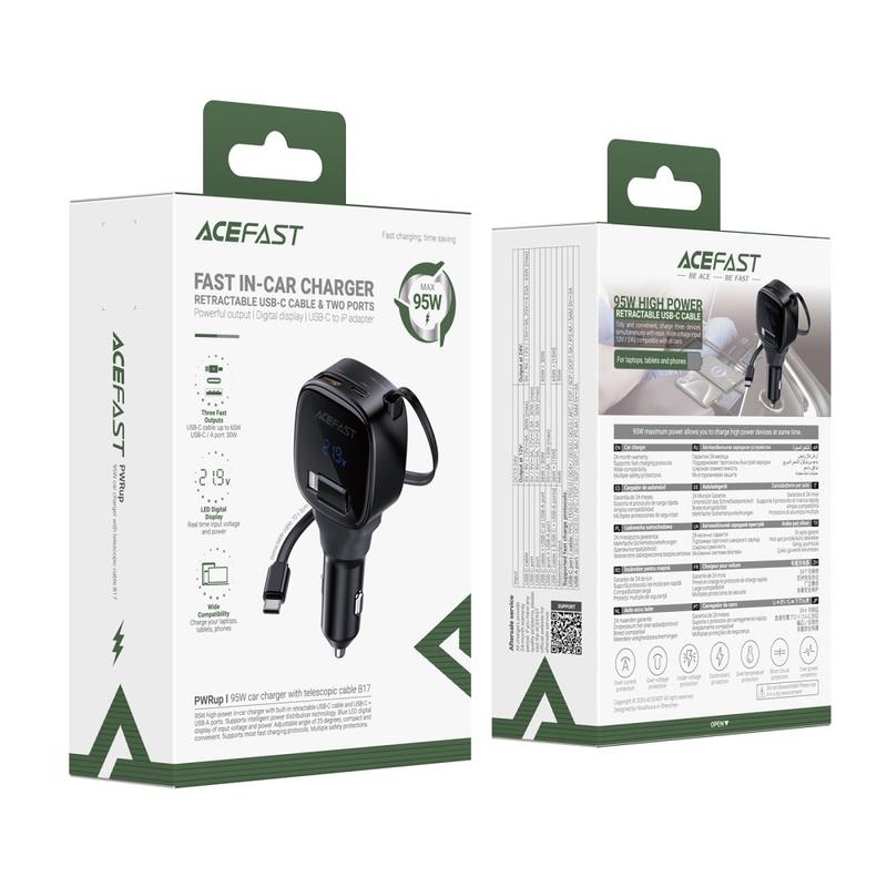 ACEFAST B17 combina prestazioni, praticità e design premium in un unico accessorio compatto. Il suo cavo retrattile elimina l'ingombro, il display a LED migliora la consapevolezza della ricarica e la potente potenza combinata di 95 W assicura una ricarica rapida e affidabile per un'ampia gamma di dispositivi. Che si tratti di pendolarismo o di viaggi, è un upgrade di grande valore per ogni automobilista.