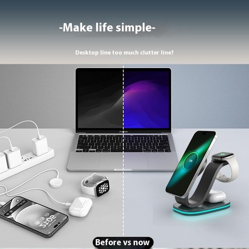 Riducete il disordine sulla scrivania con un unico supporto che offre una ricarica wireless veloce da 15 W, ricarica lo smartwatch a 2 W, alimenta gli auricolari a 3 W e funge anche da luce notturna.