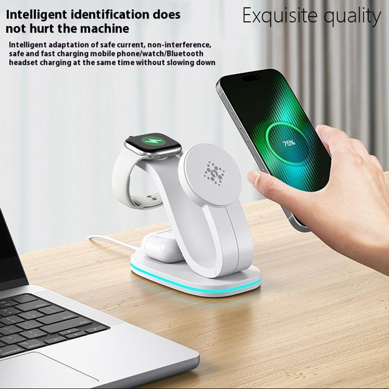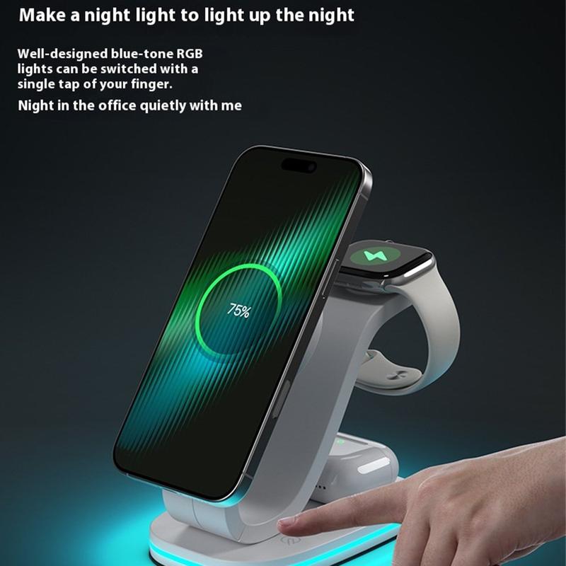 B-28 Caricabatterie wireless 3 in 1 con luce notturna: alimenta telefono, orologio e auricolari in un unico punto