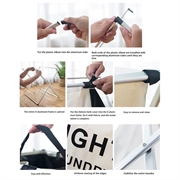 - Montaggio: Inserire i gomiti nei tubi → collegare il telaio a X → fissare la copertura in tessuto Oxford con le cinghie.