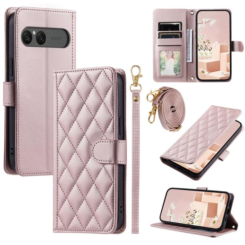 Custodia a portafoglio trapuntata di lusso con tracolla e cinturino per Sony Xperia 10 VII - Copertura protettiva con motivo a rombi