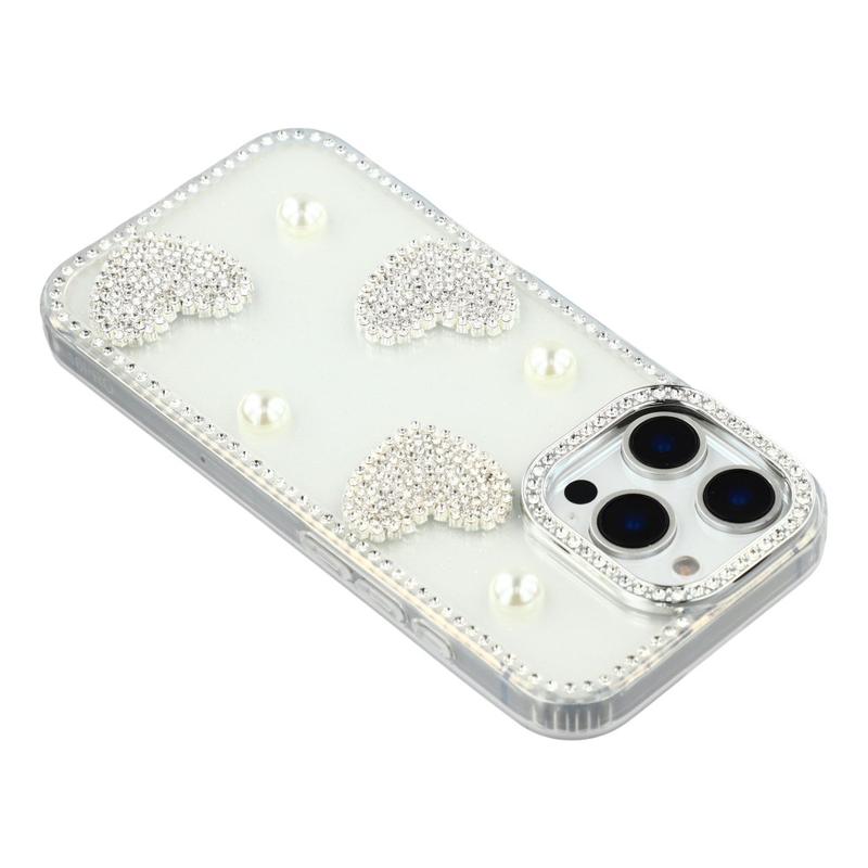 Questa custodia per iPhone 16 Pro combina l'affidabilità della protezione quotidiana con lo stile glamour. Dotata di strass scintillanti intorno ai bordi e di decorazioni a forma di cuore di perla sul retro, trasforma il vostro iPhone 16 Pro in un accessorio alla moda e lo protegge da graffi e urti.