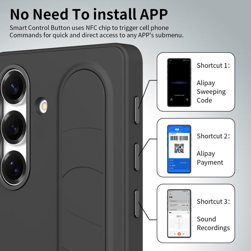 Dotata di tre pulsanti intelligenti abilitati alla tecnologia NFC, questa custodia ibrida intelligente consente di impostare l'accesso rapido ad app come Fotocamera, Torcia o Screenshot con una sola pressione. Nessuna ricarica, nessuna applicazione aggiuntiva: solo funzionalità semplici e immediate.