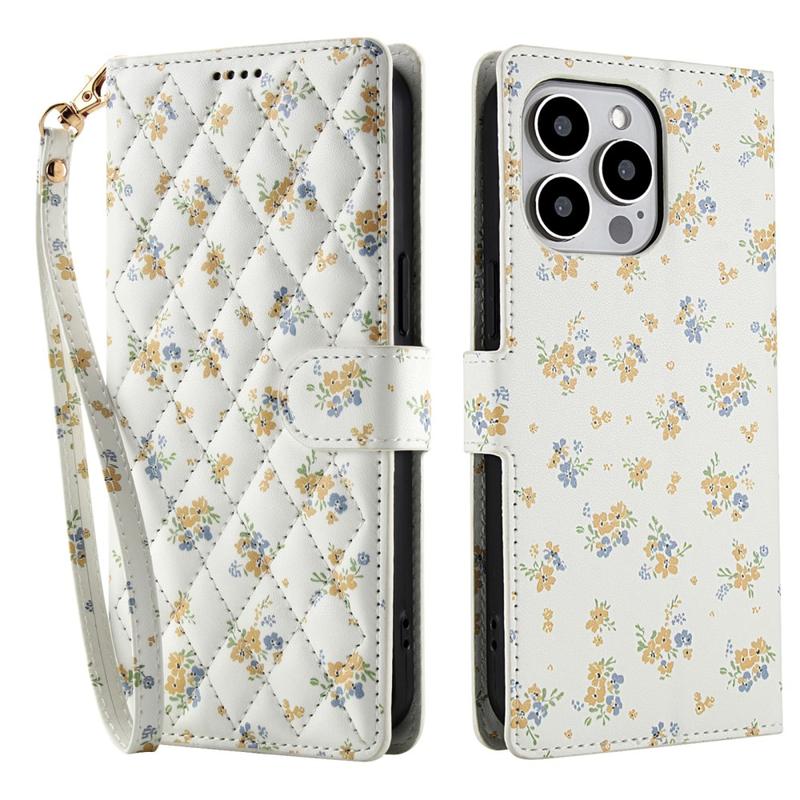 Custodia a portafoglio floreale a rombi per iPhone 16 Pro - con cinturino e scomparti per carte di credito