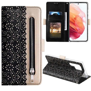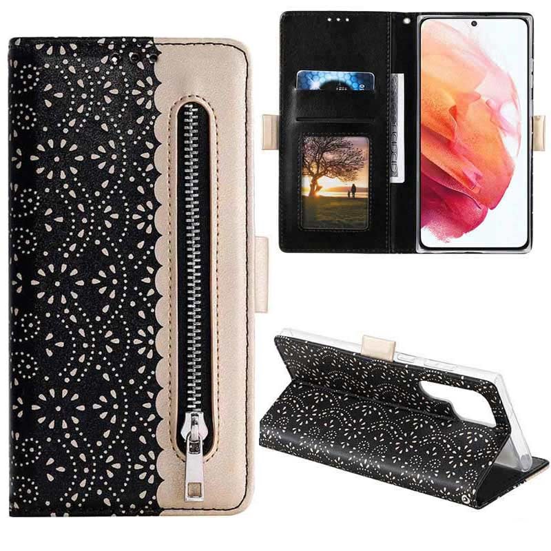 Mantieni il tuo sublime Samsung Galaxy S22 Ultra 5G in perfette condizioni con questa custodia alla moda con motivo a pizzo. Oltre al telefono, puoi riporre tutte le tue carte essenziali e i tuoi soldi in una tasca separata.