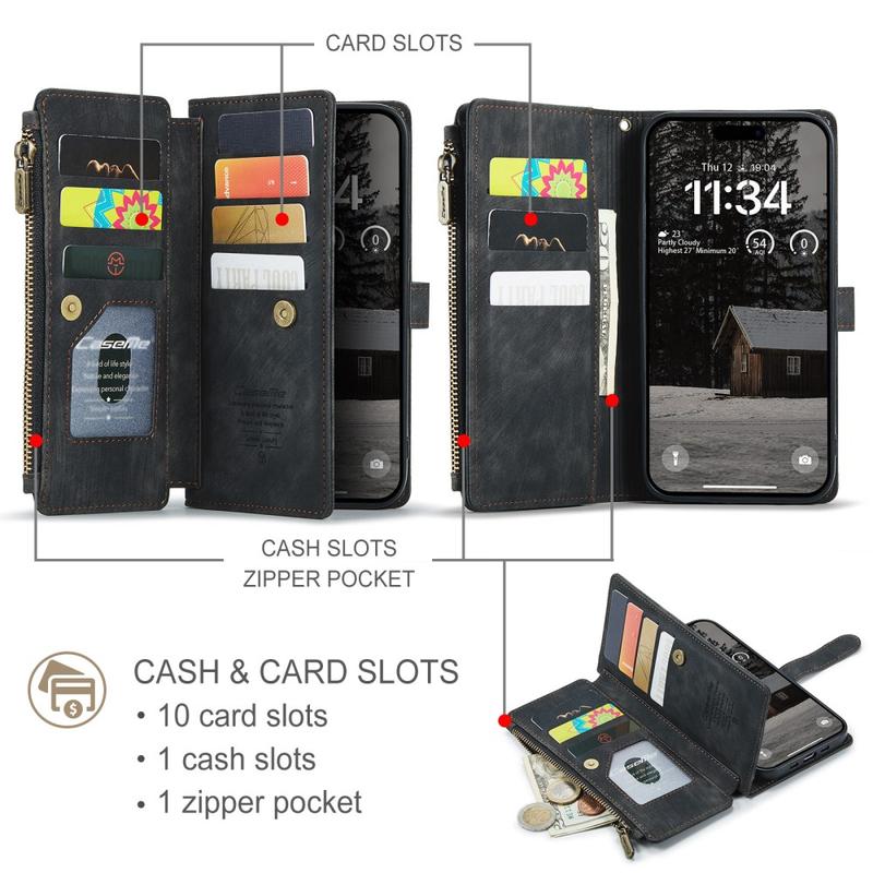 La custodia multifunzionale Caseme C30 per iPhone Air offre una protezione eccezionale a tutto tondo e un design esclusivo e raffinato. Questa elegante custodia è realizzata in poliuretano di alta qualità, rinforzata con una copertura interna in TPU antiurto che avvolge perfettamente il tuo iPhone Air. Nel frattempo, la custodia a portafoglio Caseme C30 è arricchita da numerosi scomparti per carte, un ampio scomparto per denaro all'interno e una tasca esterna con cerniera, il tutto protetto da una chiusura magnetica sicura.