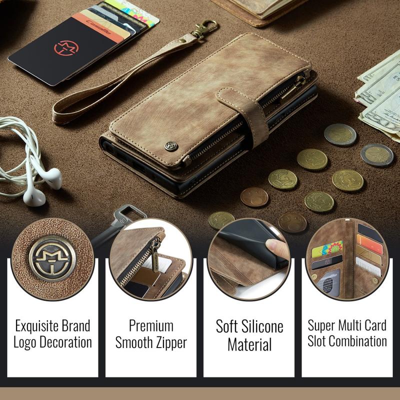La custodia multifunzionale Caseme C30 per iPhone 17 Pro offre una protezione eccezionale a tutto tondo e un design esclusivo e raffinato. Questa elegante custodia è realizzata in poliuretano di alta qualità, rinforzata con una copertura interna in TPU antiurto che avvolge perfettamente il tuo iPhone 17 Pro. Nel frattempo, la custodia a portafoglio Caseme C30 è arricchita da numerosi scomparti per carte, un ampio scomparto per denaro all'interno e una tasca esterna con cerniera, il tutto protetto da una chiusura magnetica sicura.