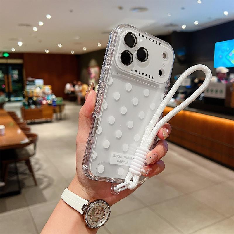 Aggiungete fascino e protezione al vostro iPhone 17 Pro con questa custodia ibrida a pois. Realizzata con una miscela di TPU e PC, offre durata, flessibilità e protezione quotidiana contro graffi e cadute. Il guscio posteriore trasparente sfoggia un giocoso design a pois e include una pellicola in vetro temperato per proteggere la fotocamera. Con un laccetto da polso abbinato e la frase motivazionale "GOOD THINGS HAPPEN", questa custodia unisce stile, positività e funzionalità in un unico prodotto.