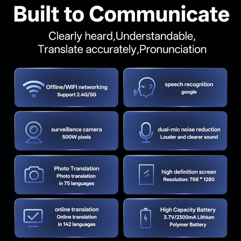 Rompete le barriere linguistiche ovunque con il traduttore vocale intelligente T22, un potente dispositivo portatile progettato per viaggiatori, professionisti e comunicatori globali. Dotato di un ampio schermo HD da 5.5 pollici, traduzione AI-powered e Wi-Fi a doppia banda, offre traduzioni rapide e accurate in 142 lingue per testo, voce e foto.