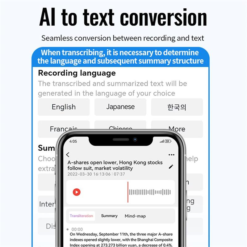 Abbinato all'AIREC-APP via Bluetooth, questo dittafono può trascrivere il parlato in testo in tempo reale in 188 lingue. Offre anche traduzioni istantanee, rendendolo uno strumento essenziale per rompere le barriere linguistiche negli affari o nei viaggi.
