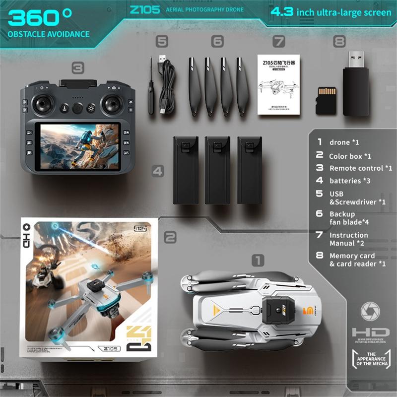 Z105 Drone intelligente a doppia telecamera con display da 4.3" Controller e 3 batterie - Quadcopter con motore brushless che evita gli ostacoli