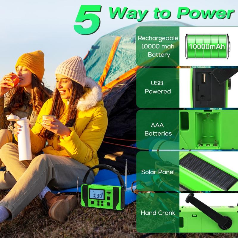 Non rimarrete mai senza energia grazie a quattro metodi di ricarica versatili: Pannello solare (0,1 W), generatore a manovella, ingresso Type-C, batteria AAA di backup (batterie AAA non incluse). Questo assicura che la radio rimanga alimentata durante le emergenze, i viaggi in campeggio, le tempeste e le avventure remote.