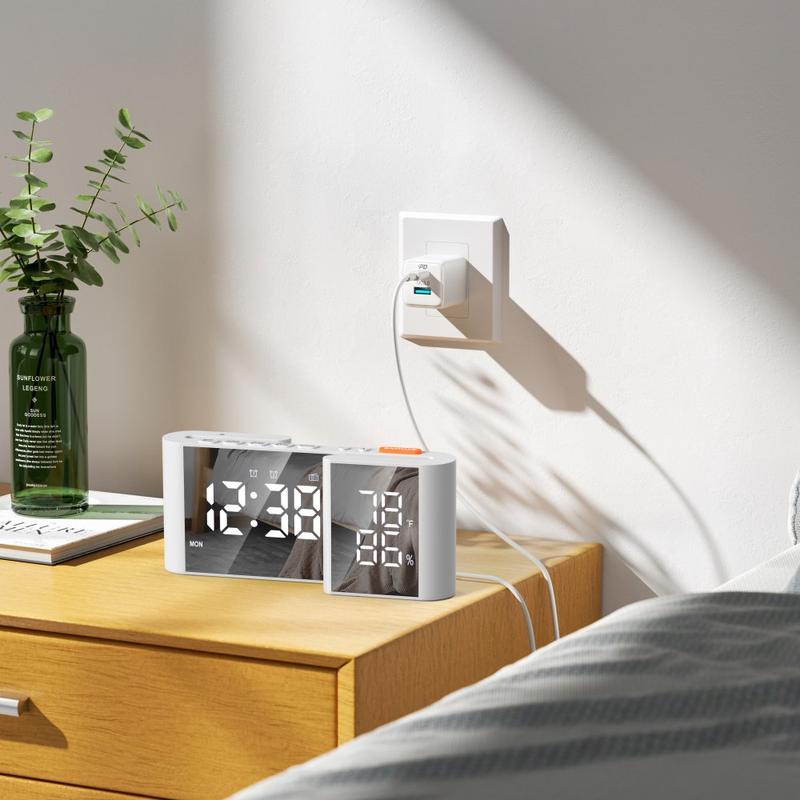 Il doppio display a LED da 6 pollici è dotato di due pannelli collegati per fornire informazioni chiare e di facile lettura. La superficie frontale specchiata conferisce un aspetto elegante, mentre il corpo curvo a forma di S si adatta perfettamente a qualsiasi camera da letto moderna, ufficio o spazio abitativo.