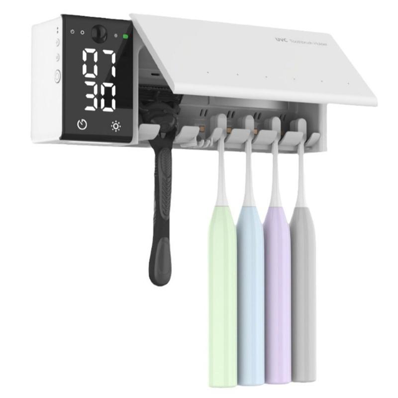 ES909 Igienizzatore intelligente a raggi UV per spazzolini da denti - Supporto per asciugatura e sterilizzazione a parete con orologio a LED, timer e installazione senza trapano