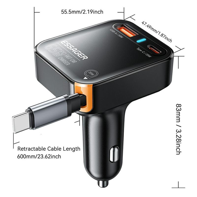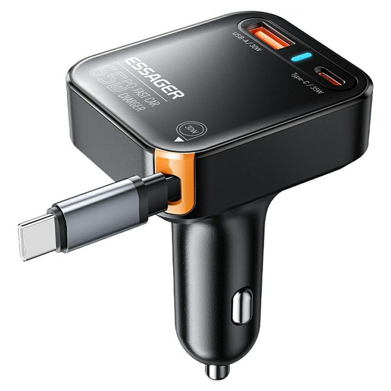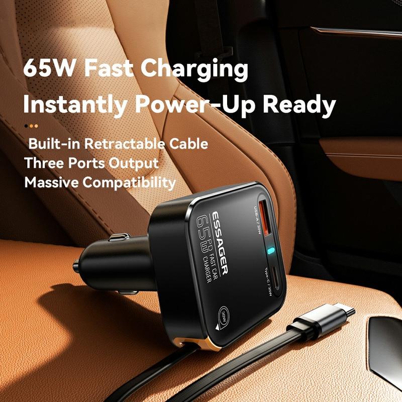 Il caricatore rapido ESSAGER 65W combina funzionalità e design accurato. Il suo cavo retrattile mantiene in ordine l'auto, mentre il sistema intelligente di gestione dell'alimentazione assicura una ricarica rapida e sicura dei dispositivi ogni volta. Compatto, resistente ed elegante, è un must per chi è sempre in movimento.