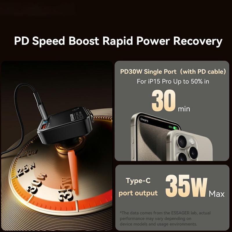 Essager 65W Caricabatterie da auto veloce con cavo USB-C retrattile - Porte USB-A e Tipo-C, distribuzione intelligente dell'alimentazione