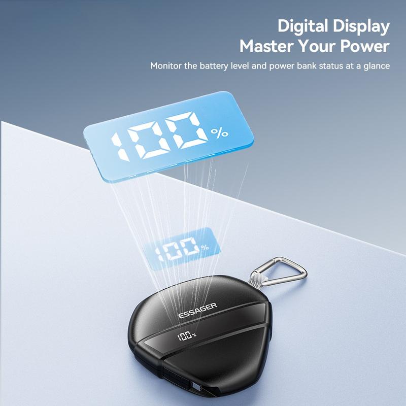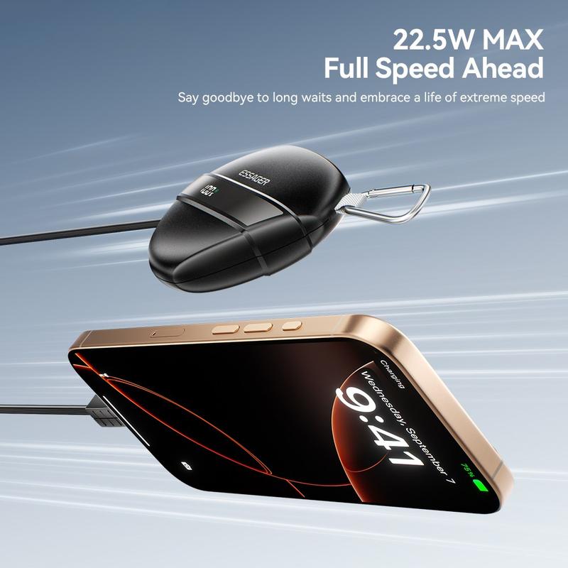 Il power bank ESSAGER da 22,5 W a ricarica rapida offre una ricarica ad alta velocità, un comodo cavo integrato, una struttura resistente e un design adatto ai viaggi, che lo rendono un ottimo compagno per l'uso quotidiano, il pendolarismo e le attività all'aperto.