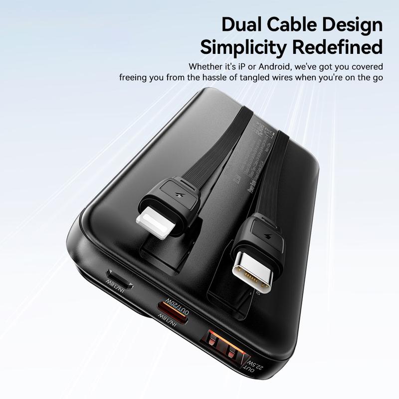 Dotato di cavi integrati Type-C e Lightning, questo power bank elimina la necessità di portare con sé cavi separati, ideale per gli utenti con più dispositivi.