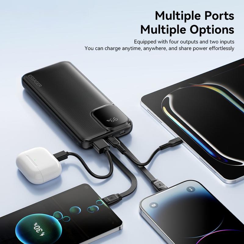 Il power bank digitale ESSAGER combina prestazioni di ricarica elevate, doppi cavi integrati e un chiaro display a LED con percentuale in un design compatto e affidabile, perfetto per gli utenti che desiderano una soluzione all-in-one senza dover portare con sé altri accessori.