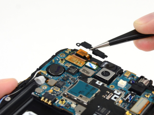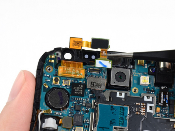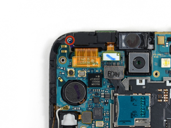 Inserisci la punta di un attrezzo di apertura in plastica (se non ce l'hai, usa il dito) nella piccola apertura a sinistra della fotocamera posteriore (vicino al tasto di accensione) per sollevare la cover posteriore.