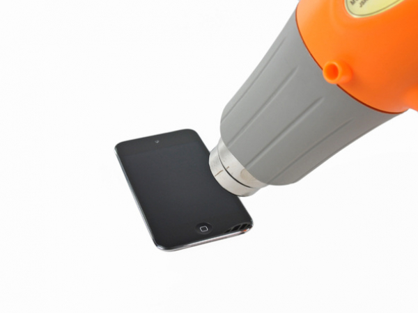 Con la pistola a caldo impostata al minimo, inizia a scaldare la parte più bassa del Touch, vicino al tasto Home.