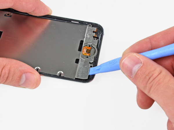 Utilizza la punta di un attrezzo di apertura in plastica per sollevare la sottile copertura di acciaio della fotocamera posteriore.