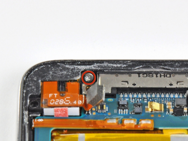 In questo punto c'è un sottilissimo cavo che collega il tasto volume/accensione alla scheda madre. Cerca di lavorare intorno all'area come mostrato, così da non spezzare il cavo, che è molto fragile.