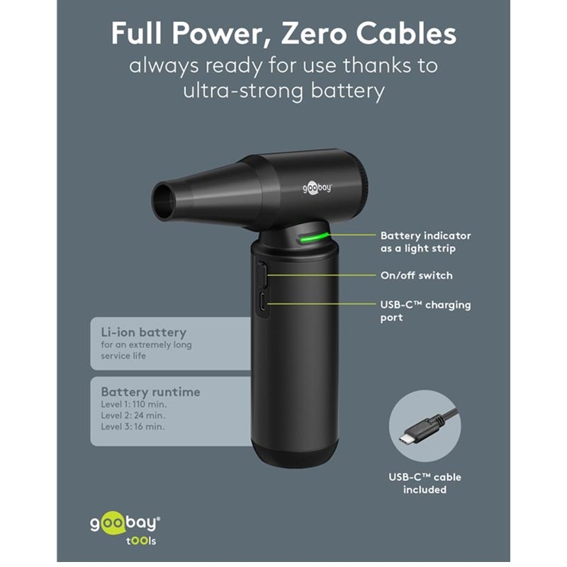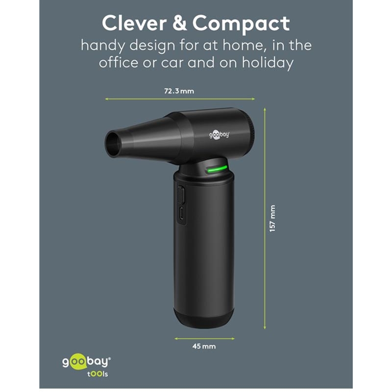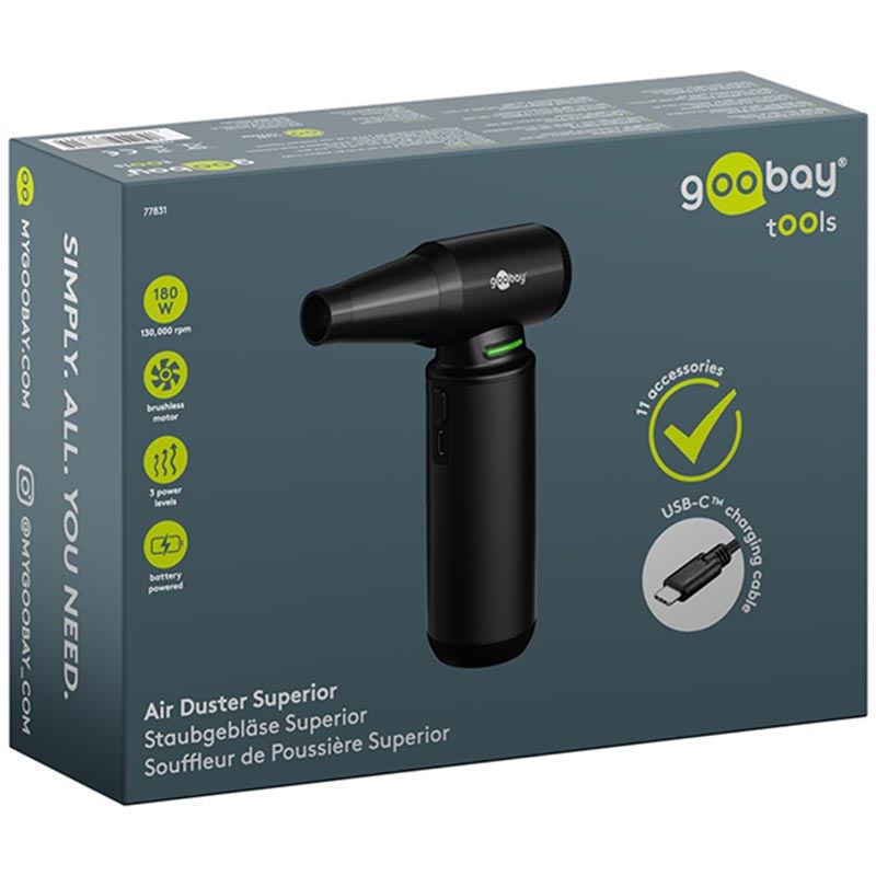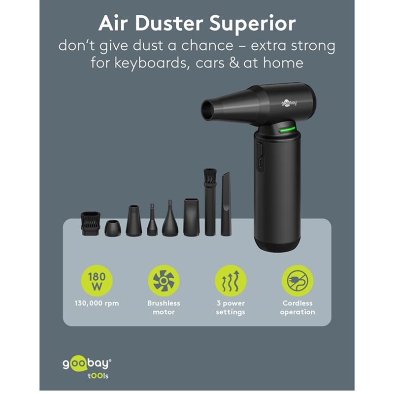 Goobay Spolverino d'aria Superior - Soffiatore elettrico cordless da 130000 giri/minuto con 8 ugelli e 3 spazzole (180 W, design in alluminio)