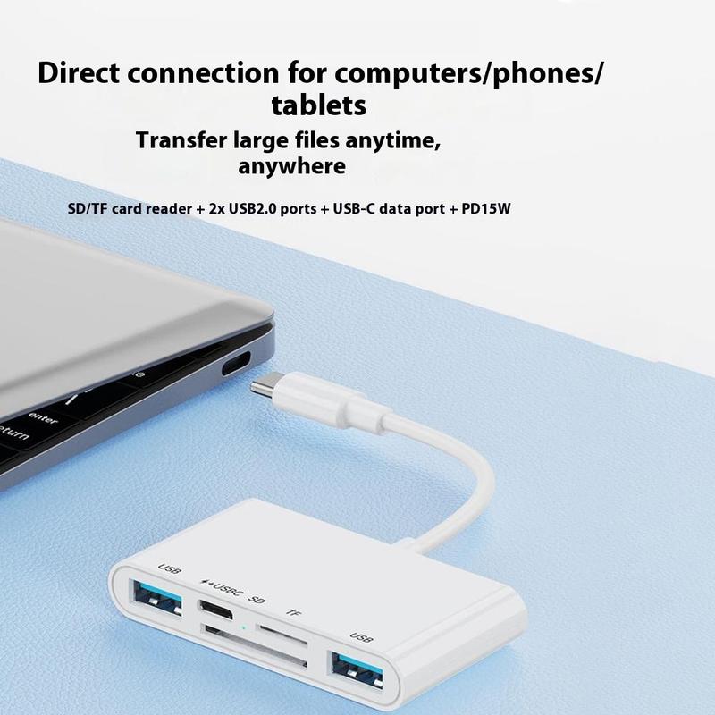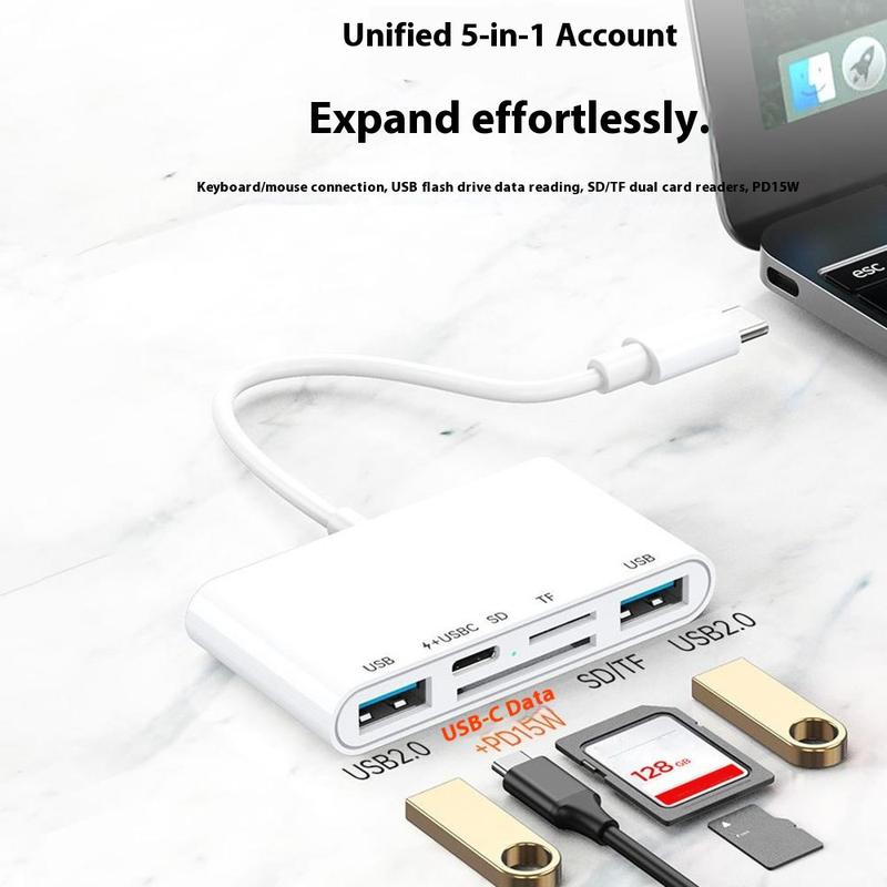 Adattatore 5-in-1 USB-C OTG - Hub USB-C con doppia porta USB 2.0, ricarica PD a 15W e lettore di schede SD/TF per iPhone, MacBook e dispositivi USB-C