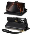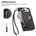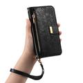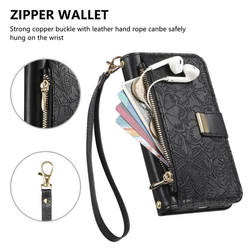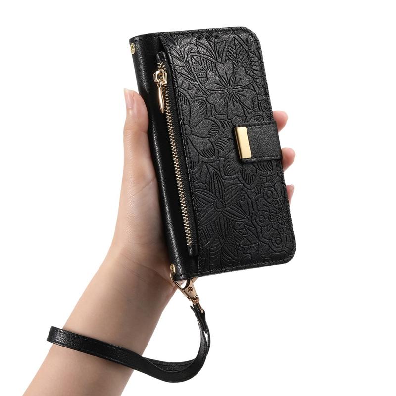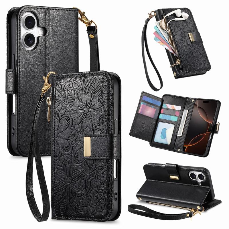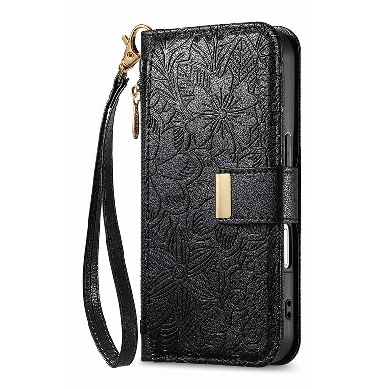 Custodia a portafoglio con motivo floreale e a foglie, tasca con cerniera e cinturino da polso per iPhone 16