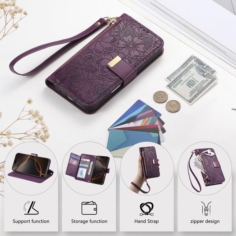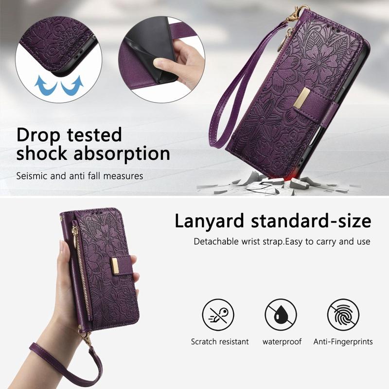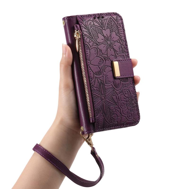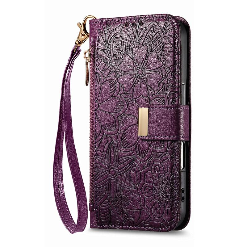 Custodia a portafoglio con motivo floreale e a foglie, tasca con cerniera e cinturino da polso per iPhone 16