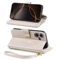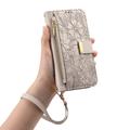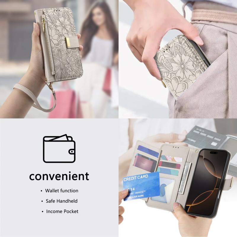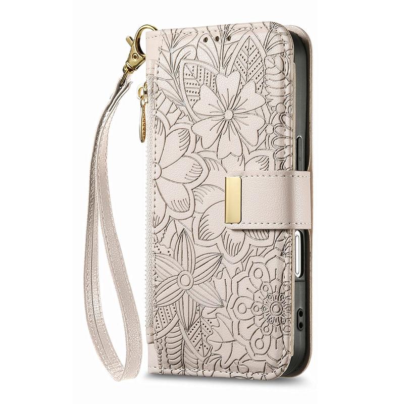 Custodia a portafoglio con motivo floreale e a foglie, tasca con cerniera e cinturino da polso per iPhone 16