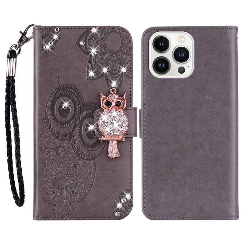 - Custodia a portafoglio con strass di gufo per iPhone 16 Pro