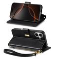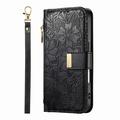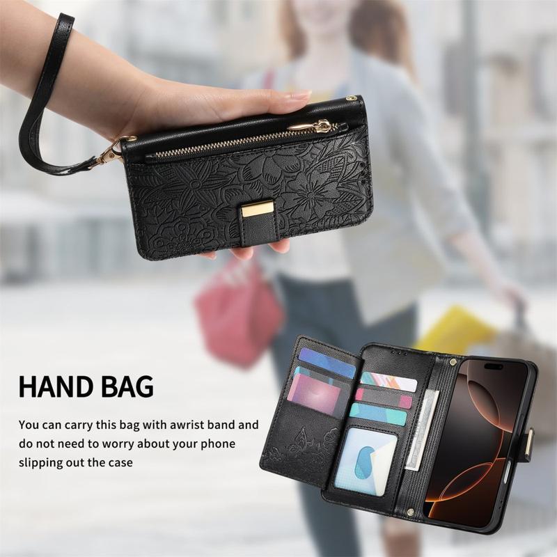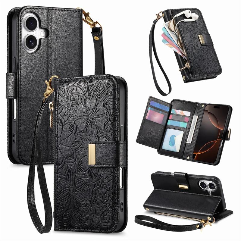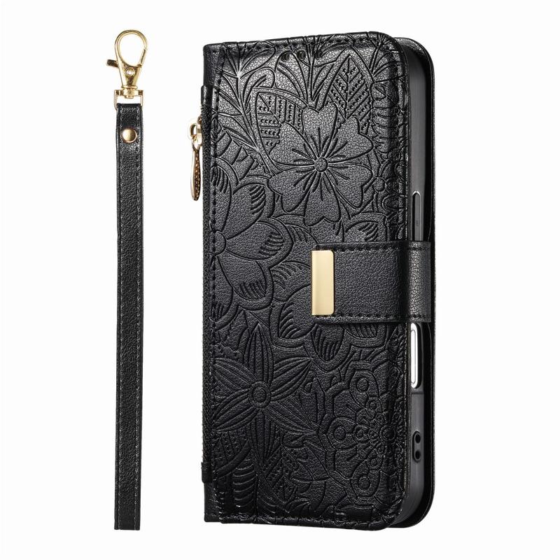 Custodia a portafoglio con motivo floreale e a foglie, tasca con cerniera e cinturino da polso per iPhone 17