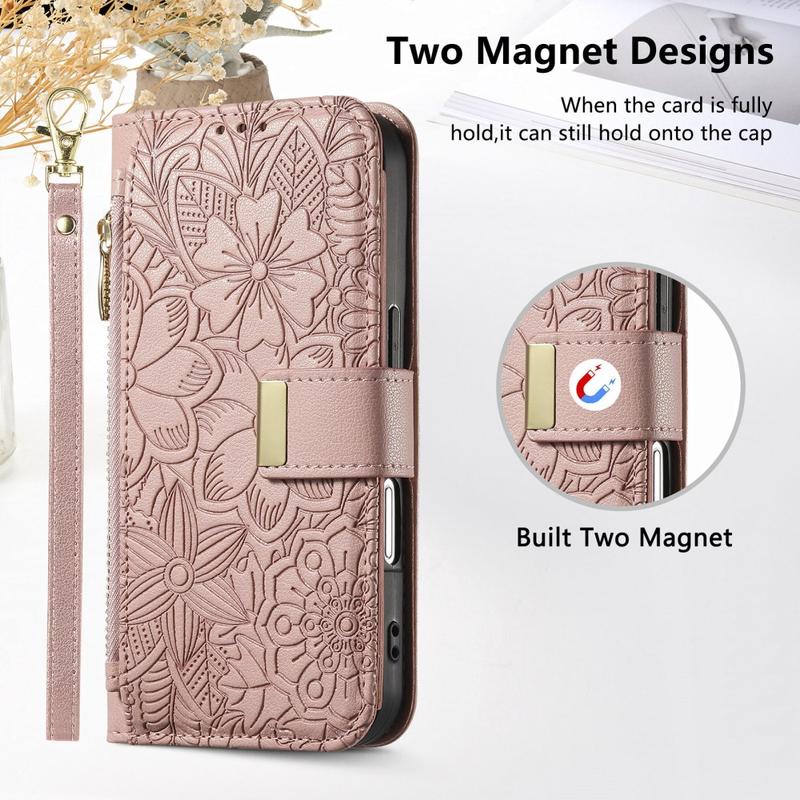 Custodia a portafoglio con motivo floreale e a foglie, tasca con cerniera e cinturino da polso per iPhone 17 Pro Max