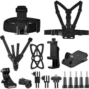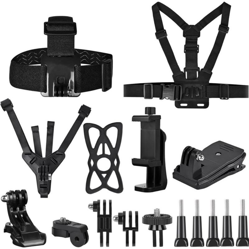 Kit accessori 11 in 1 per action camera GoPro: fascia per la testa, imbracatura pettorale, supporto per mento, clip per zaino e set supporto per telefono