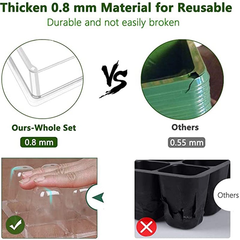 A differenza dei vassoi sottili da 0,5 mm, questo design aggiornato da 0,8 mm offre una durata superiore, riutilizzabilità e resistenza alla deformazione, ideale per più stagioni di coltivazione.