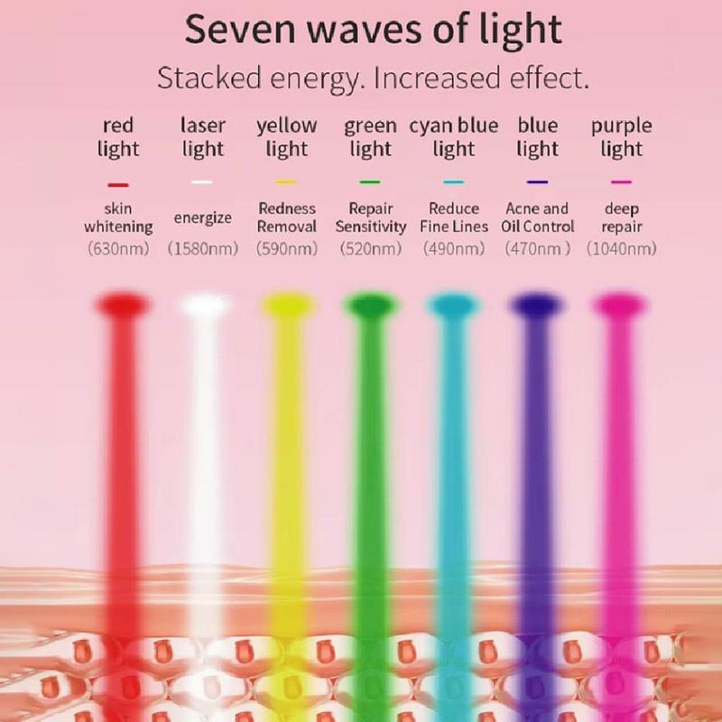 - Terapia LED a 7 colori - Include luce rossa (630nm), blu (460nm), verde (515nm), viola, giallo-arancione, ciano e bianca, per affrontare diversi problemi della pelle.