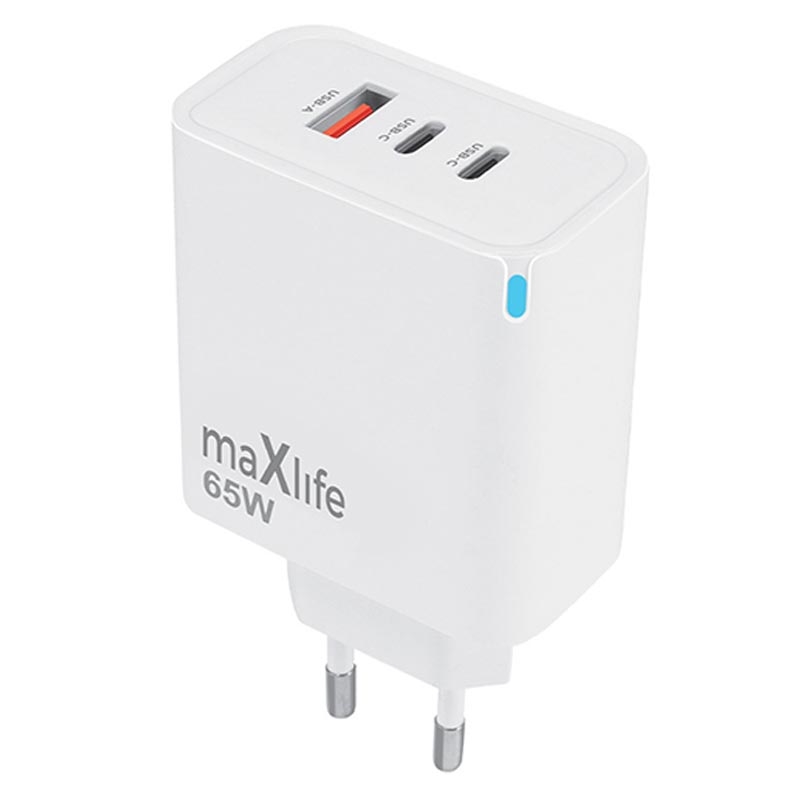 Caricabatterie Maxlife MXTC-09-65ACC GaN - Adattatore di ricarica rapida da 65 W con 2 porte USB-C PD e 1 porta USB-A QC