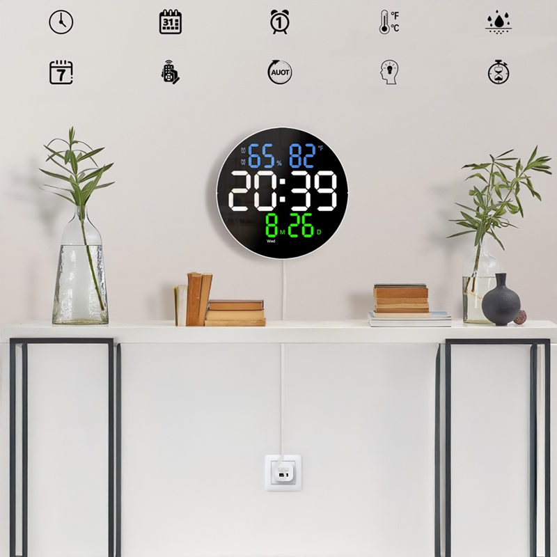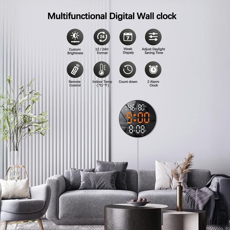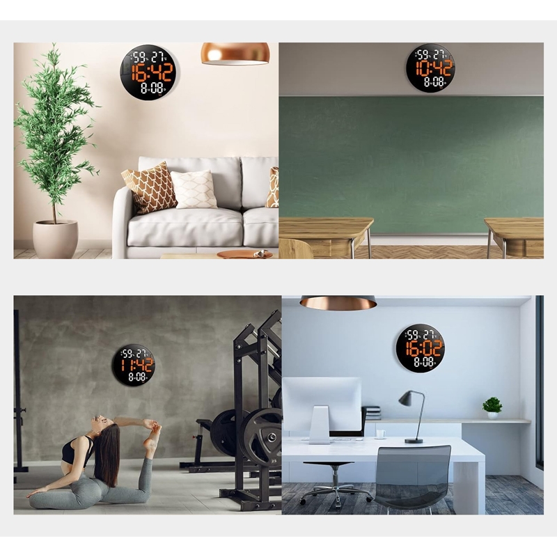 6672 Orologio da parete silenzioso a LED - Display da 25,5 cm per temperatura e umidità con luce notturna ambientale e telecomando