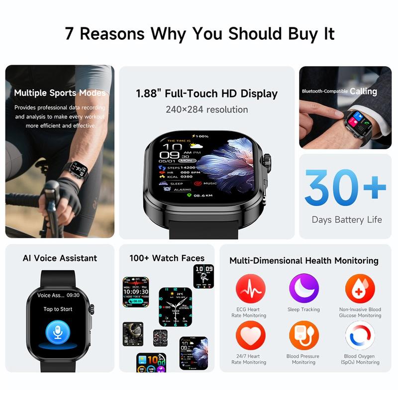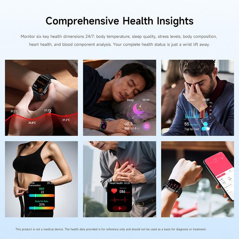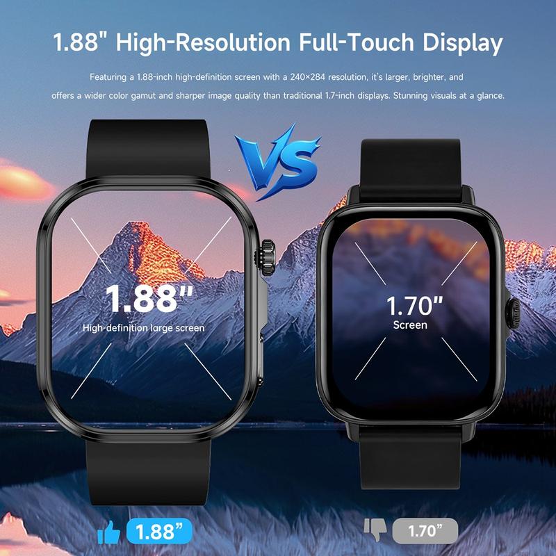 L'orologio intelligente GE52 combina il monitoraggio avanzato della salute con la praticità moderna, offrendo la misurazione dell'ECG, il rilevamento della frequenza cardiaca, il rilevamento dell'ossigeno nel sangue, il monitoraggio della temperatura e molto altro ancora, tutto dal polso. L'ampio display HD da 1,88 pollici offre immagini nitide e vivaci che superano i tradizionali schermi da 1,7 pollici, rendendo l'uso quotidiano più chiaro e piacevole.