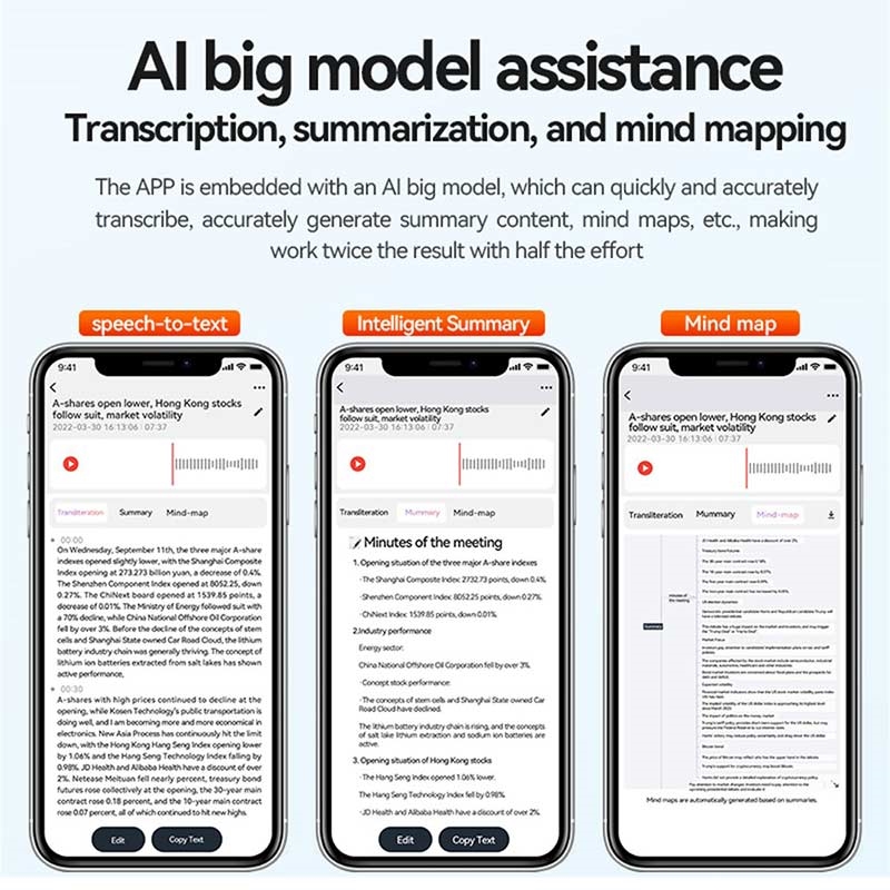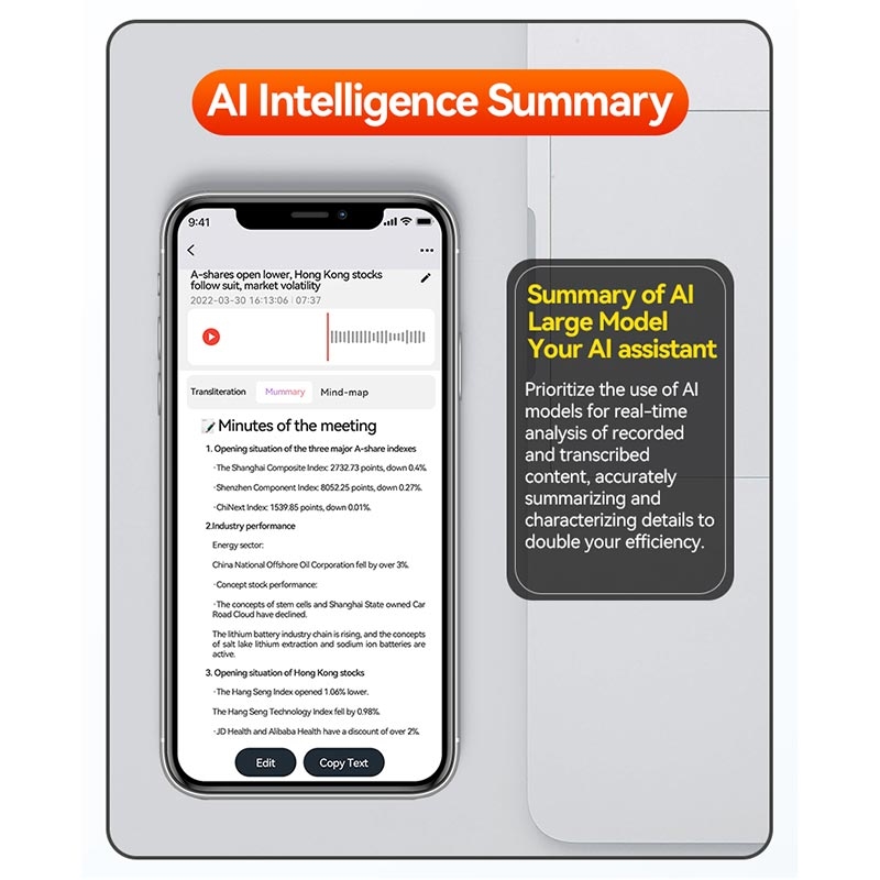 Audio di alta qualità: Registra in formato WAV per preservare la chiarezza e i dettagli in ogni conversazione, lezione o riunione. Trascrizione basata sull'intelligenza artificiale: Connettiti all'AIREC-APP tramite Bluetooth per usufruire di trascrizione e traduzione in tempo reale in 188 lingue con integrazione ChatGPT.