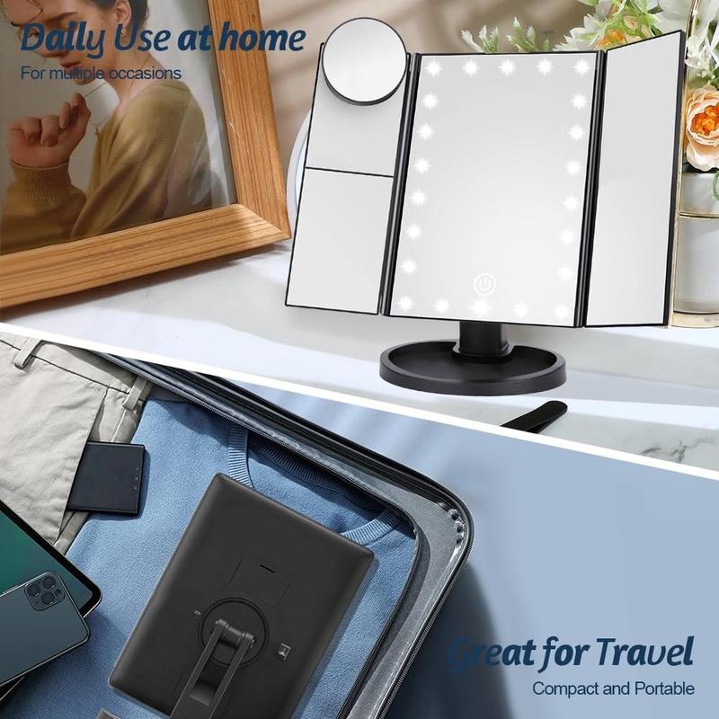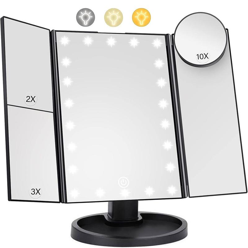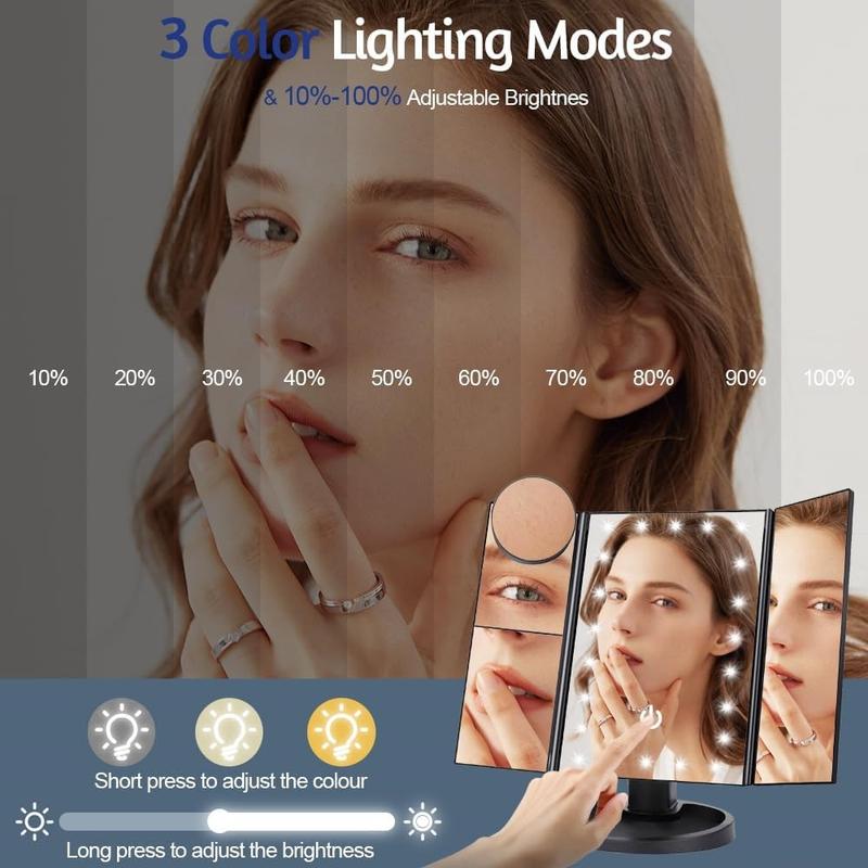 Specchio per il trucco pieghevole su 3 lati con 22 luci LED - Specchio di vanità con ingrandimento 1X/2X/3X/10X
