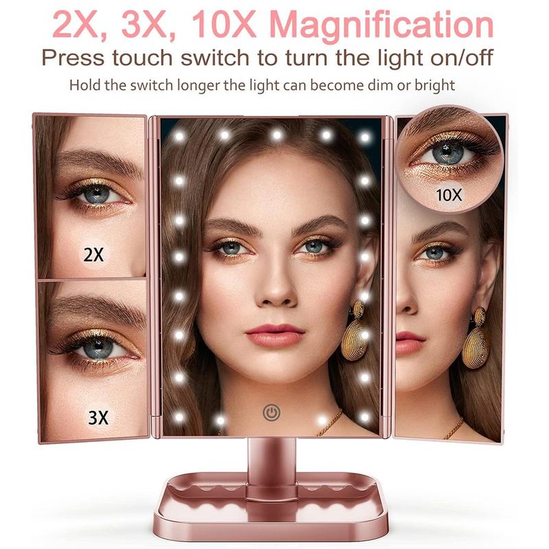 Specchio per il trucco pieghevole su 3 lati con 22 luci LED - Specchio di vanità con ingrandimento 1X/2X/3X/10X