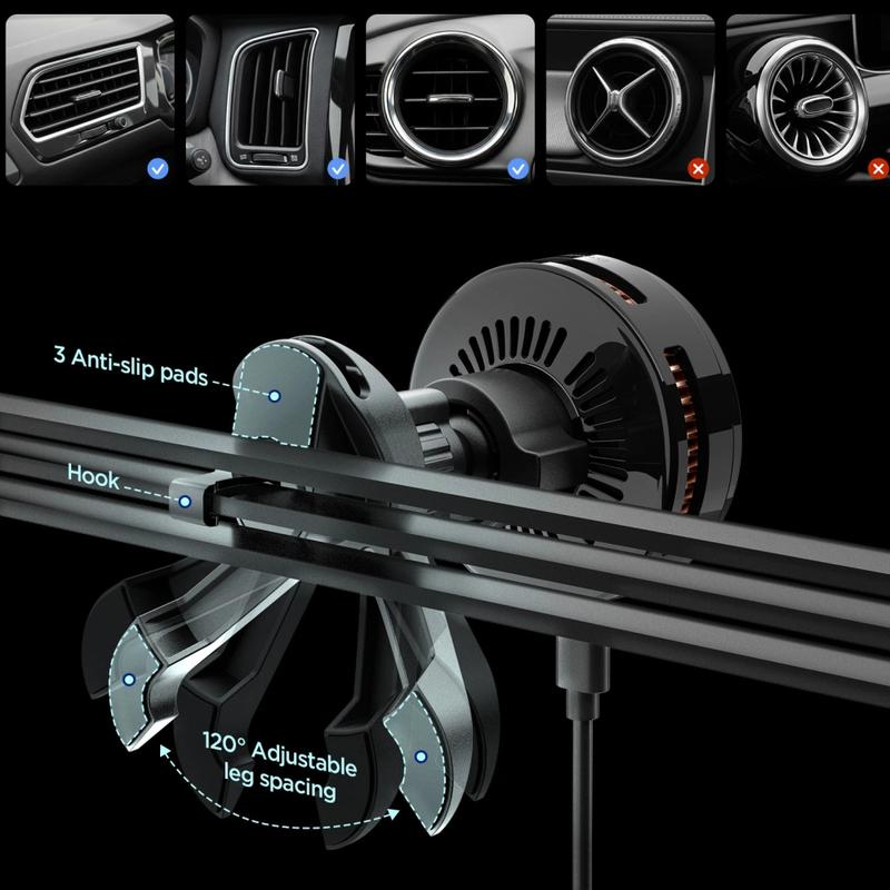 Rinforzato con magneti di grado N52, il supporto offre un fissaggio magnetico eccezionalmente forte, che mantiene il telefono sicuro e perfettamente allineato su strade accidentate. La testa rotante a 360° consente di posizionare il telefono in orizzontale o in verticale, mentre la robusta clip per la presa d'aria si adatta alla maggior parte dei veicoli (esclusi alcuni modelli Mercedes-Benz con prese d'aria sporgenti).