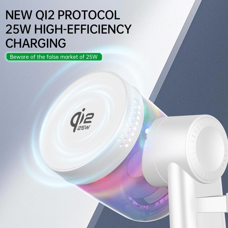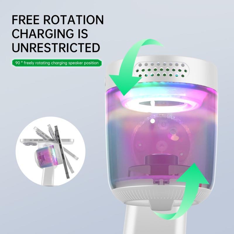 Eliminate l'ingombro dei cavi e alimentate tutti i vostri oggetti essenziali in un unico posto con la stazione di ricarica wireless magnetica QI2.2. Progettata per le scrivanie e i comodini moderni, combina un caricatore wireless magnetico da 25W, un altoparlante Bluetooth e un'illuminazione ambientale RGB, creando la soluzione di ricarica multifunzionale definitiva per il telefono, gli auricolari e lo smartwatch.